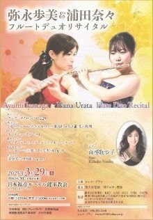 | ■出演者・曲目 | 【出演者】 弥永歩美(Fl 41期) 浦田奈々(Fl) 南部歌歩子(Pf) 【曲目】 アンダンテとロンド Op.25/F.ドップラー 2本のフルートのための6つの二重奏曲より 第3番 変ホ長調/W.F.バッハ カンタービレとプレスト/G.エネスコ アンダンテ・パストラールとスケルツェッティーノ/P.タファネル ハンガリーの主題による幻想曲 Op.35/F.&K.ドップラー 協奏的三重奏曲 Op.119/F.クーラウ |