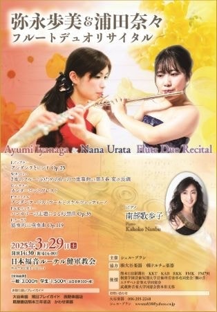 | ■出演者・曲目 | 【出演者】 弥永歩美(Fl 41期)・浦田奈々(Fl)・南部歌歩子(Pf) 【曲目】 アンダンテとロンド Op.25/F.ドップラー 2本のフルートのための6つの二重奏曲より 第3番 変ホ長調/W.F.バッハ カンタービレとプレスト/G.エネスコ アンダンテ・パストラールとスケルツェッティーノ/P.タファネル ハンガリーの主題による幻想曲 Op.35/F.&K.ドップラー 協奏的三重奏曲 Op.119/F.クーラウ |