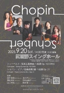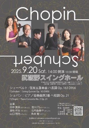 | ■公演内容 | シューベルト:弦楽五重奏曲 ハ長調 Op.163 D956 ショパン:ピアノ協奏曲第2番 ヘ短調 Op.21 |